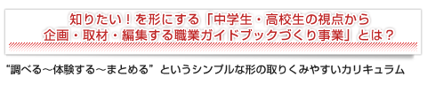 - 中学生・高校生自らが、「本(職業ガイドブック)づくり」や『取材』というコミュニケーション体験を通して、社会や「人」を学ぶと同時に、職業を体験・探索することにより、職業観の醸成を図ること。